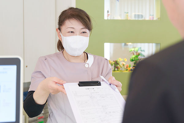 ご来院いただきましたら、まずは受付にて健康保険証をご提示ください。あわせて問診票へのご記入をお願いいたします。現在のお悩みや痛みがある場所、治療に対するご不安、お身体の健康状態など、些細なことでも構いませんので詳しくご記入ください。当院は基本予約制とし、お一人おひとりに十分なお時間を確保しております。