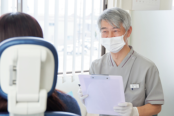 検査結果をもとに、現在のお口の状態を分かりやすくご説明します。ご自身の現状を正しく知っていただくことが、予防への第一歩です。その上で、数年先を見据えた全学的な治療計画をご提案いたします。メリット・デメリットを含め納得いくまでお話しし、患者さまご自身が自発的に治療に臨めるよう、歩調を合わせて進めてまいります。