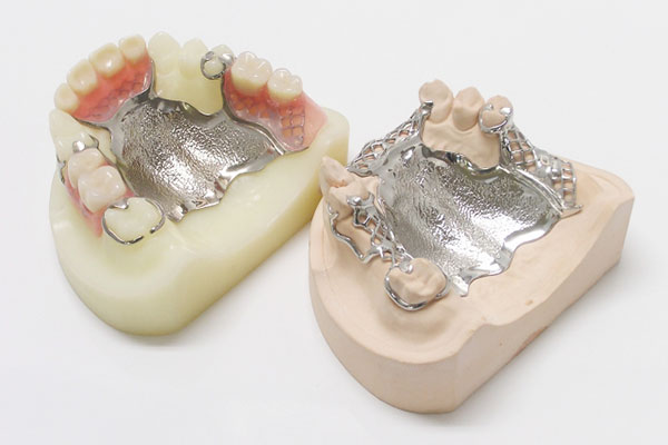 金属床義歯は、入れ歯の主要な部分を薄くて丈夫な金属(ゴールド、チタン、コバルトクロム等)で作る入れ歯です。保険のプラスチック製に比べて非常に薄く作製できるため、お口の中の違和感が少なく、発音もしやすいのが特徴です。また、金属は熱伝導性に優れているため、食べ物の熱さや冷たさが瞬時に伝わり、毎日の食事がより美味しく感じられるようになります。耐久性も高く、長期にわたって安定した**かみ合わせ(咬合)**を維持したい方にお勧めの選択肢です。