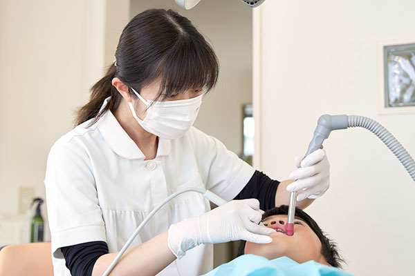 歯周病治療(良好な口腔環境の維持管理)は長期にわたるため、患者さまとスタッフのコミュニケーションが何より重要です。当院では歯科衛生士を担当制とし、いつも同じスタッフがお口の変化を見守ります。担当制にすることで、患者さまの食生活やブラッシングの癖といった「生活習慣」まで深く理解した上でのアドバイスが可能になります。「話しやすい」「自分のことを分かってくれている」という安心感が、モチベーションの維持と、確かな治療結果に繋がると考えています。