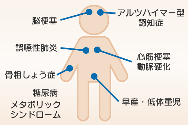 近年の研究では、歯周病が全身の健康に多大な影響を及ぼすことが明らかになっています。歯周病菌が血管を通じて全身に回ると、心疾患などの循環器系疾患や、誤嚥性肺炎のリスクを高めます。特に糖尿病とは密接な相関関係があり、互いの症状を悪化させることが分かっています。また、アルツハイマー型認知症や骨粗しょう症、妊娠中の方においては早産や低体重児出産のリスクにも繋がります。お口を整えることは、一生の健康を守ることそのものなのです。